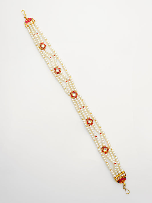 Elevate your bridal or festive look with this exquisitely handcrafted Aadita Matha Patti. Featuring an intricate arrangement of lustrous pearls and square kundan stones, this traditional head ornament is designed to offer regal elegance. The vibrant red meenakari detailing on the side panels adds a charming contrast to the soft...