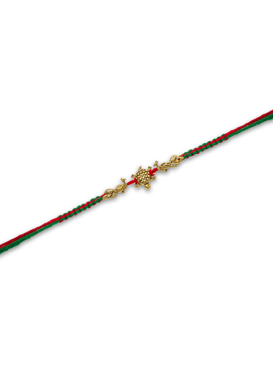 Symbolizing longevity and strength, this Aadita Tortoise Design Rakhi blends spiritual symbolism with festive charm. The intricately carved golden tortoise sits at the center of a traditional red and green thread, making it a meaningful and auspicious rakhi for your brother. A perfect blend of tradition and grace to celebrate...
