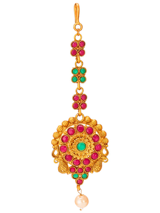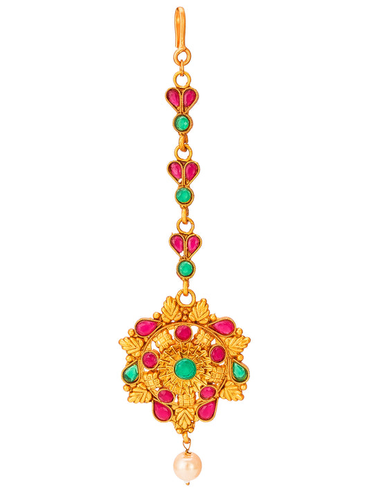 This traditional maang tikka by Aadita features a premium gold-plated finish adorned with vibrant pink and green stones in a classic floral arrangement. The design is complemented by an elegant pearl drop at the base, making it a perfect choice for weddings and festive celebrations. It is designed with a...