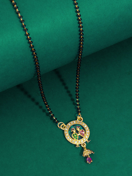 Elevate your daily ethnic attire with this exquisitely crafted Mangalsutra by Aadita. The centerpiece features an oval pendant enclosing a stylized peacock motif, detailed with white, green, and ruby-colored stones. Three delicate gold-tone chains with ball accents hang from the base, adding graceful movement to the piece. It is designed...