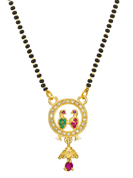 Refined and elegant, this Aadita Mangalsutra features a circular pendant rimmed with sparkling white stones. The interior design depicts stylized birds in a unique arrangement, set with vibrant green and pink stones. The look is completed with a traditional bell-shaped drop and a ruby-colored stone finial, offering a sophisticated touch...