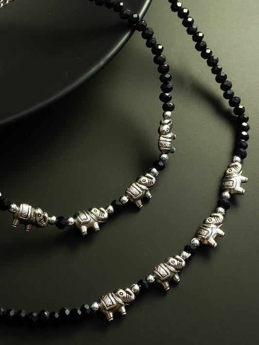 Bring charm to your feet with Aadita's silver-plated elephant charm anklet, adorned with elegant black beads and intricate detailing. This handcrafted piece is a symbol of grace and tradition, designed to elevate both ethnic and casual wear. Lightweight and easy to wear, it features a secure hook and extension chain...