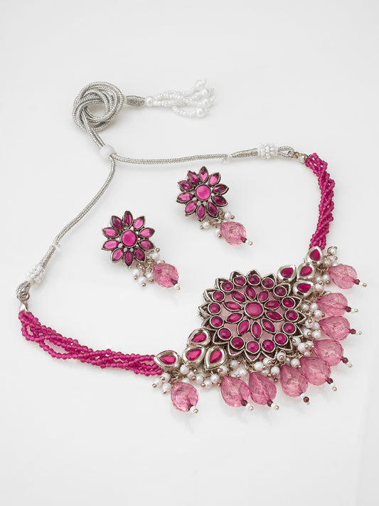 Embrace artisanal elegance with this stunning oxidized silver-plated choker, featuring a captivating central floral motif encrusted with vibrant pink stones. The design is elevated by multi-strand pink beaded chains and a lush fringe of translucent pink crystal droplets and delicate white seed pearls that offer a graceful movement. This statement...