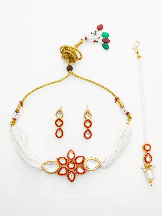 Grace your festive look with this radiant red and white choker necklace set from Aadita. Featuring an intricately crafted floral kundan pendant with pearl clusters, this elegant design is paired with coordinating earrings and a maang tikka. Perfect for traditional occasions, it beautifully blends royal charm with modern finesse. Type:...