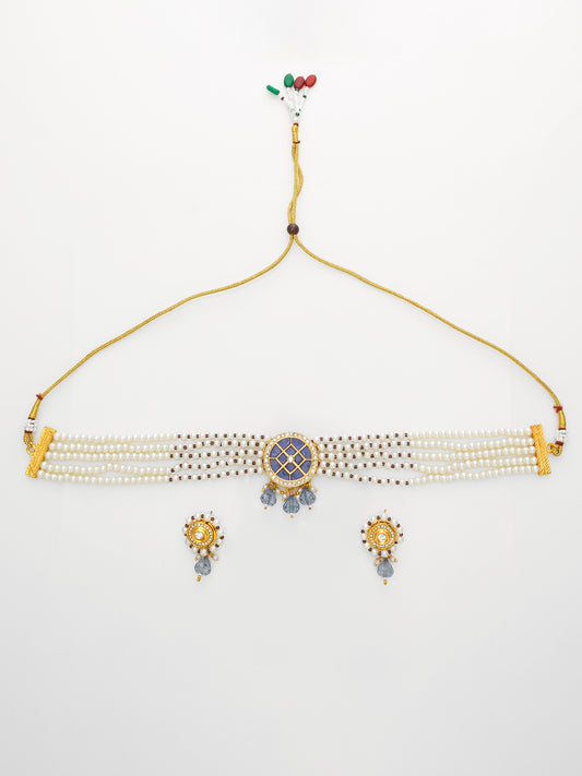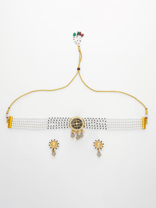 Elevate your festive or traditional look with this exquisite Aadita choker necklace set. Featuring a unique round pendant with a black enamel-like centerpiece, this handcrafted design is complemented by strands of white pearls accented with black beads. The earrings mirror the central design for a perfectly coordinated set, offering elegance...