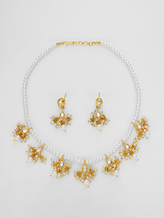 Elevate your traditional look with this stunning Aadita bridal necklace set featuring rich white beads and intricate kundan work. Designed to bring elegance and grace, this handcrafted piece boasts a royal flair with its pearl-beaded strings and gold polished settings. Perfect for bridal events and festive occasions, it pairs beautifully...
