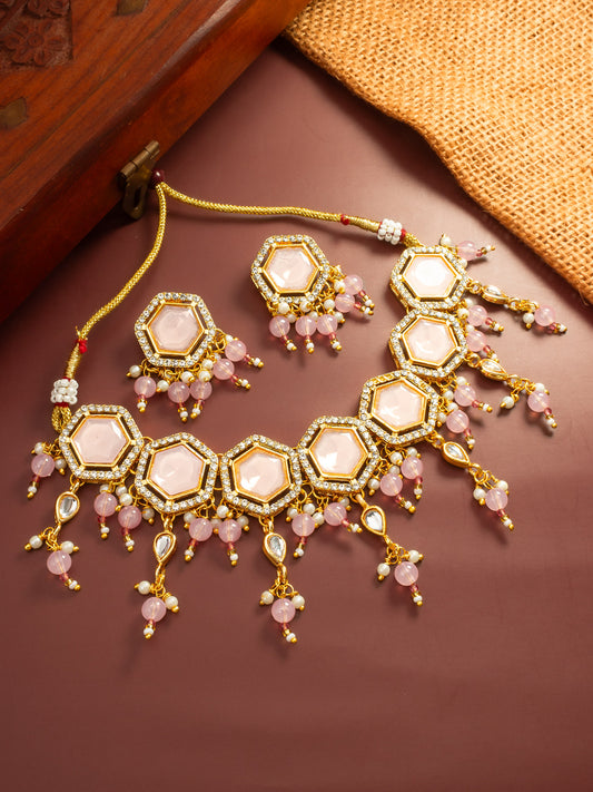 This premium choker set features a series of striking hexagonal light pink stones, each framed by a shimmering border of white accents. The traditional design is elevated by delicate pink bead dangles and small pearl clusters, creating a sophisticated look for festive occasions. The necklace is secured with an adjustable...