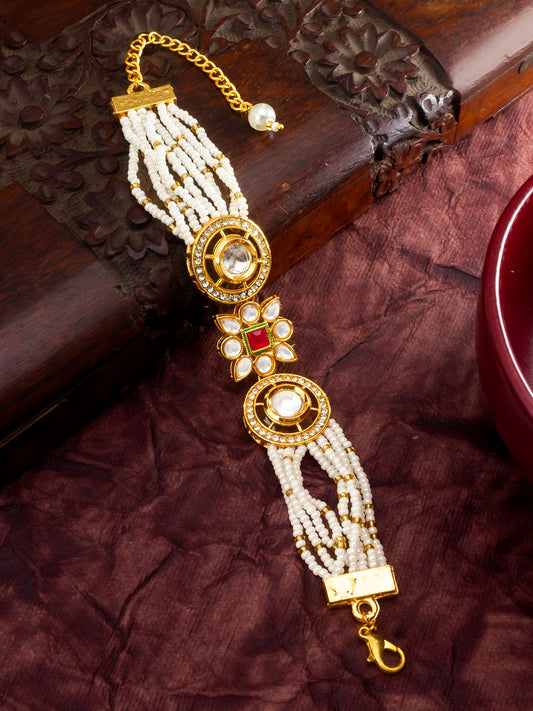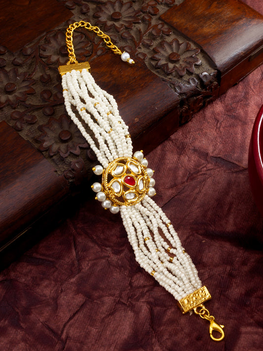 Elevate your ethnic ensemble with this exquisite Aadita bracelet, featuring multiple strands of lustrous white beads that embody timeless grace. The design is anchored by intricate gold-plated circular motifs and a central floral accent set with Kundan-style stones and a vibrant red centerpiece. Perfect for weddings and festive occasions, this...