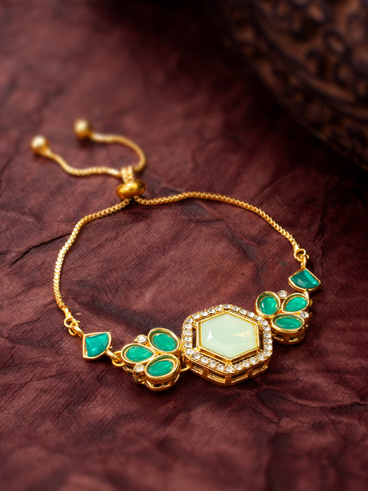 This exquisite Aadita bracelet showcases a striking hexagonal centerpiece accented by vibrant green and mint stones. The gold-plated finish enhances the brilliant luster of the carefully placed crystals, offering a regal aesthetic for contemporary ethnic styling. Designed with a convenient adjustable closure, this piece seamlessly blends geometric precision with traditional...