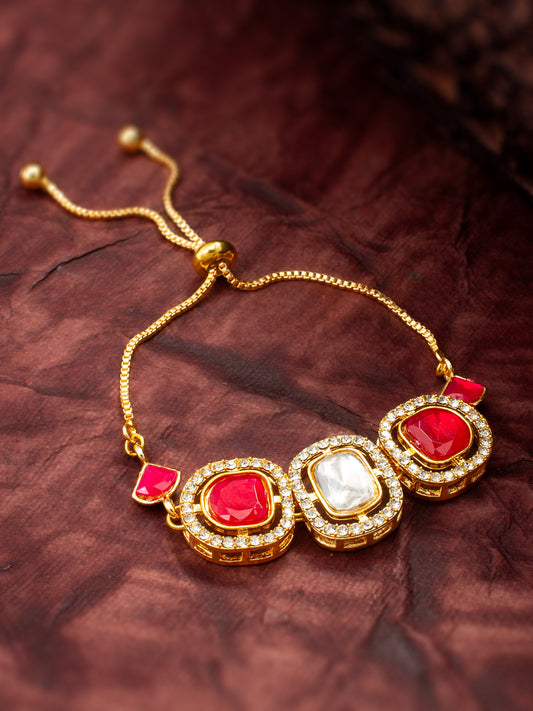 Embodying classic elegance, this Aadita bracelet features bold ruby-colored stones surrounded by a halo of white crystals. The premium gold plating provides a radiant backdrop for the rich red hues, creating a luxurious statement piece for bridal or evening wear. The adjustable slider mechanism ensures a custom fit while maintaining...