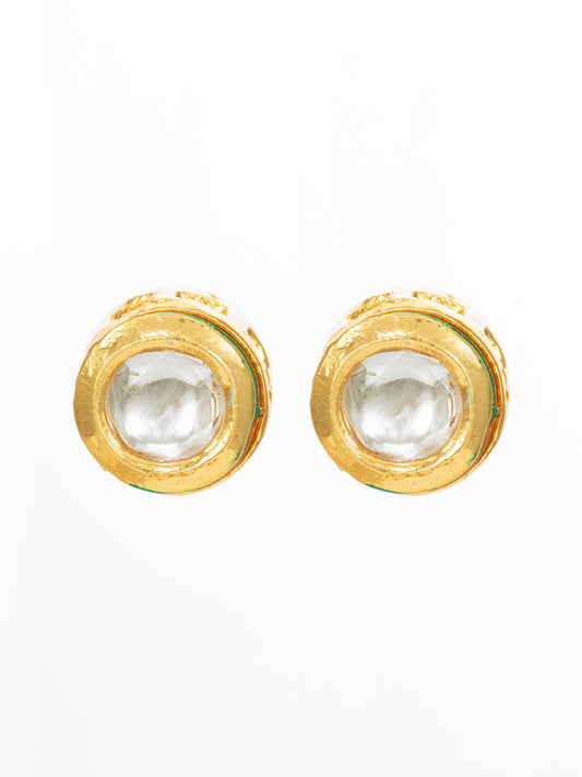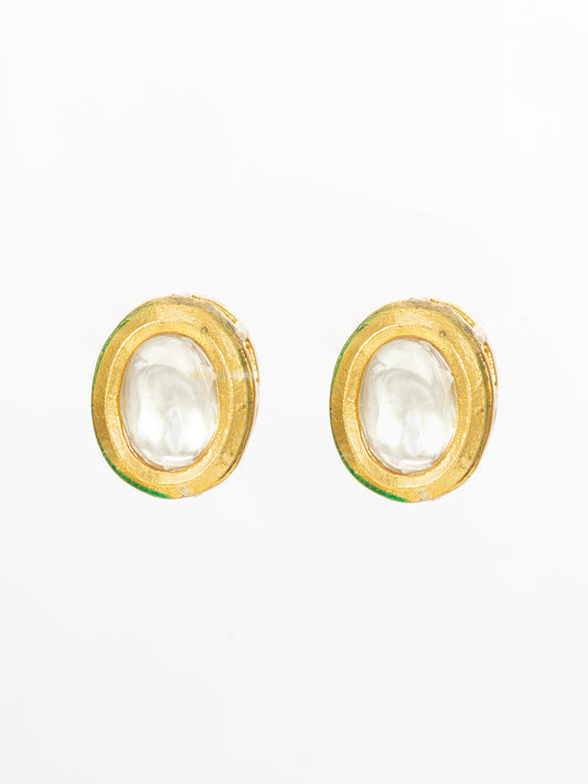 Enhance your ethnic look with Aadita's gold-plated Kundan stud earrings crafted in a classic round shape. These minimal yet elegant earrings feature a single oval Kundan piece encased in a gold finish, accented with subtle green enamel detailing on the edges. Ideal for festive occasions or everyday traditional wear, these...