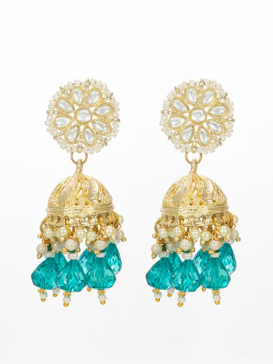 Elevate your ethnic style with Aadita's stunning teal green jhumka earrings. Crafted in a classic dome shape, these earrings feature intricate kundan floral tops accented with delicate pearls and vibrant teal green drop beads. The gold-toned finish adds a regal touch, making them perfect for festive and wedding occasions. Type:...