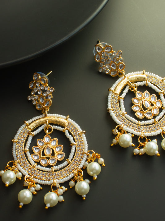 Elevate your ethnic look with Aadita's elegant gold-plated Kundan and pearl dangler earrings. Crafted with precision, these statement earrings feature a classic circular design embellished with shimmering white Kundan stones and delicate pearls. Perfect for adding a royal touch to traditional outfits, these earrings offer the perfect blend of tradition...