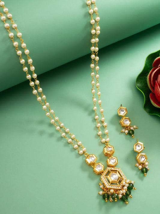 Embrace sophistication with this long-style Aadita necklace set, featuring delicate pearl strands interspersed with gold-toned hexagonal motifs. The focal point is a distinct hexagonal pendant centered with a large clear stone and finished with emerald green bead drops. This set offers a modern take on the traditional long necklace, providing...