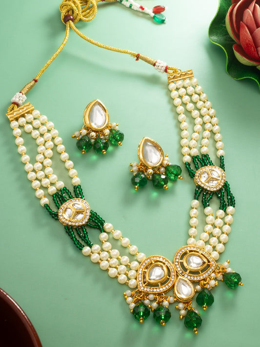 This traditional Aadita necklace set showcases sophisticated green floral stone arrangements paired with white kundan accents. The gold-plated finish enhances the deep green tones, creating a regal look suitable for formal ethnic gatherings. The set is designed with an adjustable dori closure to facilitate a perfect fit for various neck...