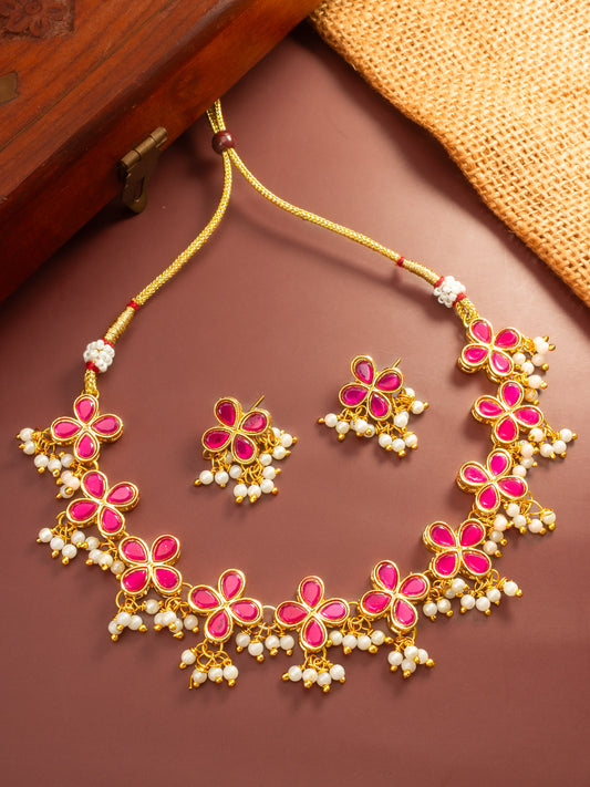 Aadita presents this vibrant necklace set featuring a series of pink floral motifs meticulously crafted with kundan-style stones. The gold-plated base provides a rich contrast to the ruby-pink hues, while the bottom is lined with small white pearl dangles for a classic aesthetic. The necklace features an adjustable dori closure...