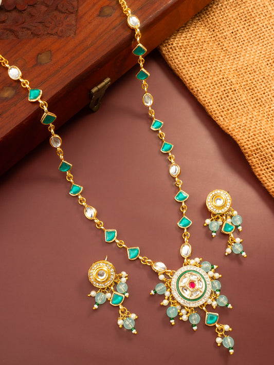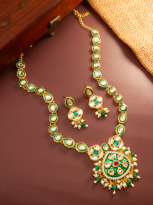 Make a bold statement with this exquisite Aadita necklace set featuring rich green enamel work and classic kundan settings. The design incorporates a large, ornate circular pendant adorned with pearls and green bead clusters, suspended from a matching stone-encrusted chain. The vibrant green tones make it a standout accessory for...