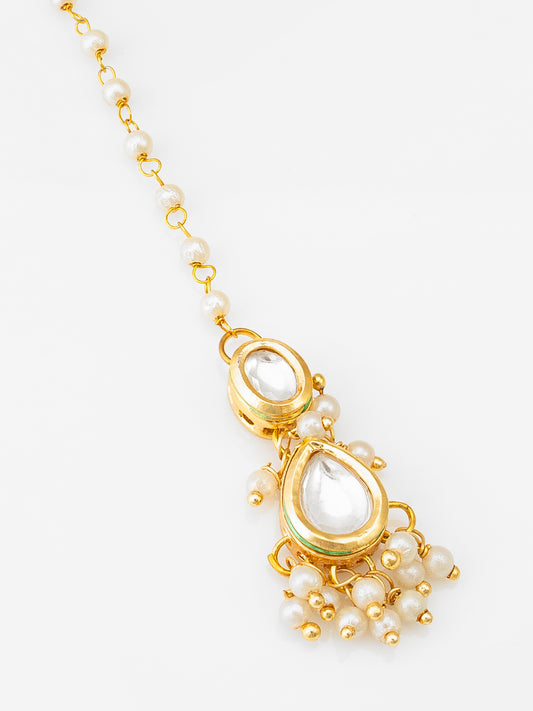Enhance your traditional charm with this exquisite Kundan Pearl Maang Tikka, designed to add elegance to any ethnic outfit. Adorned with shimmering kundan stones and pearls, this gold-plated bridal tikka features a floral centerpiece highlighted by a striking red stone at the center. Perfect for weddings, festive occasions, or cultural...