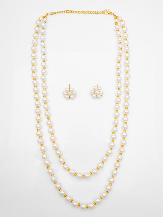 Embrace timeless elegance with Aadita's White & Gold Pearl Beaded Double Layer Necklace Set. Featuring lustrous faux pearls and golden spacers, this necklace exudes grace and class. Perfect for ethnic and Indo-western styles, its delicate dual strands add dimension to your look. The floral pearl stud earrings complete the set...