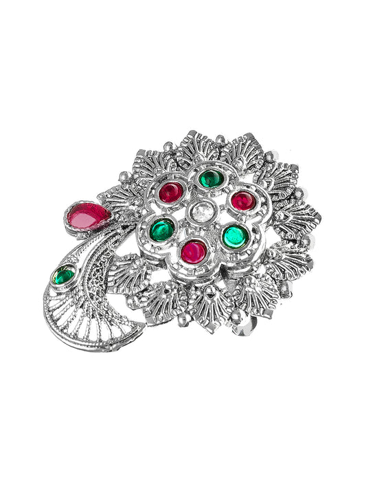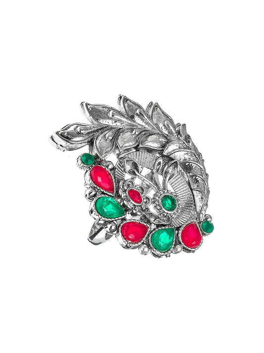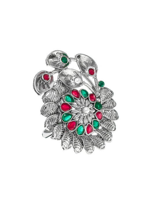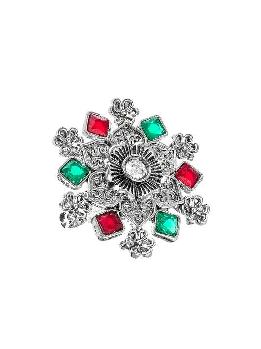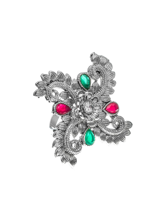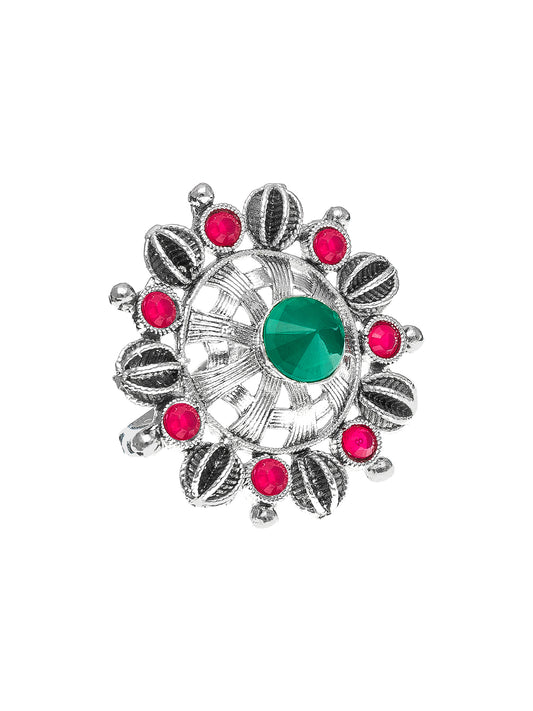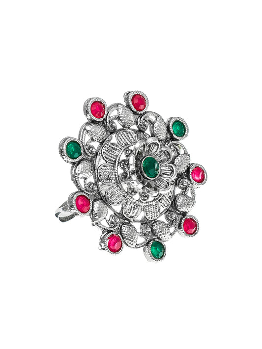 This intricately designed ring features a striking star-shaped floral motif, crafted with a premium oxidized finish for an authentic antique look. The piece is embellished with vibrant red and green stones set against textured silver-tone metalwork, creating a perfect balance of traditional charm and ethnic elegance. Ideal for festive occasions,...