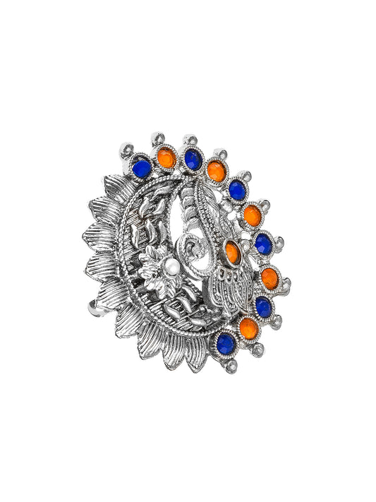 This statement piece captures the essence of traditional Indian artistry with a stylized peacock design. The oxidized silver finish provides a rich, antique backdrop for the vibrant blue and orange stones that frame the motif. Perfect for festive occasions, this ring offers an adjustable fit and intricate detailing that adds...