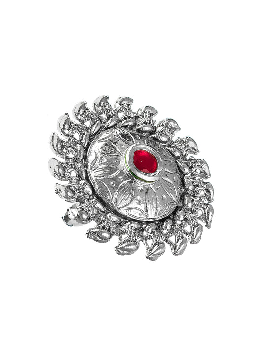 Featuring a classic circular silhouette, this ring is embossed with intricate floral patterns and edged with a delicate motif reminiscent of temple jewelry. A bold red stone sits at the center, creating a striking focal point against the matte silver oxidized finish. Its robust construction and adjustable band make it...