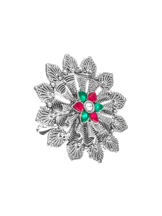 Capturing the beauty of a blossom in full bloom, this ring features layered petals with intricate striations. The center is studded with a cluster of red, green, and white stones, adding a jeweled touch to the monochrome oxidized metal. This piece perfectly complements ethnic attire, offering a balance of rustic...
