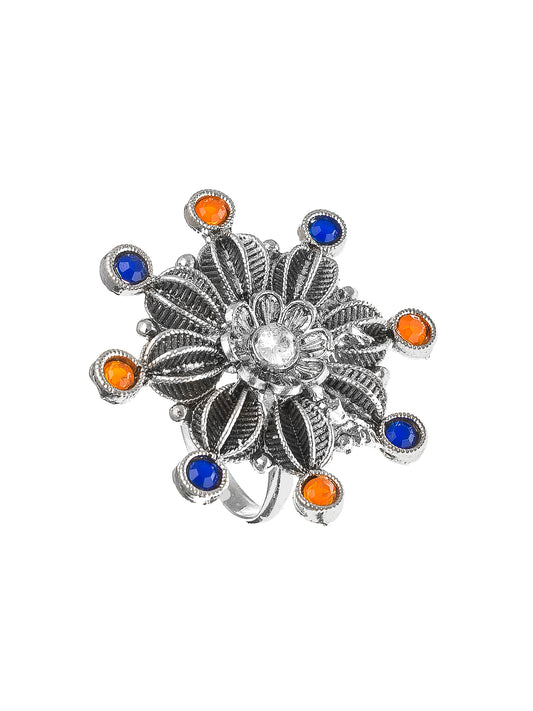 This ring presents a sharp, geometric starburst floral pattern, distinct for its bold use of color. Dark oxidized recesses contrast with polished silver ridges, while blue and orange crystals at the tips provide a playful yet traditional appeal. It is a modern interpretation of ethnic jewelry, suitable for adding a...