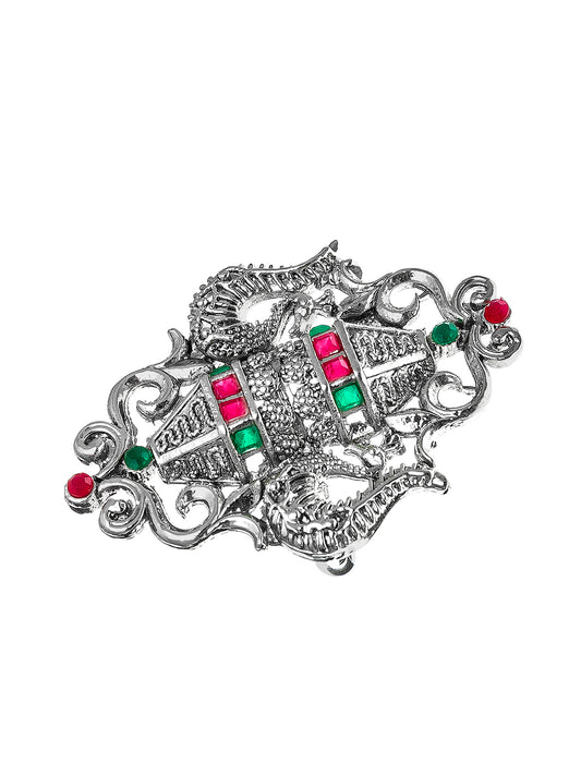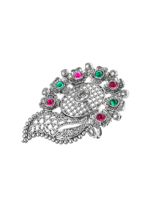 A harmonious blend of paisley curves and floral clusters defines this stunning finger ring. The design features a mix of round red and green stones set against a detailed silver-tone background. Its asymmetrical shape adds a dynamic flair, making it a conversation starter at weddings and festive gatherings. The adjustable...