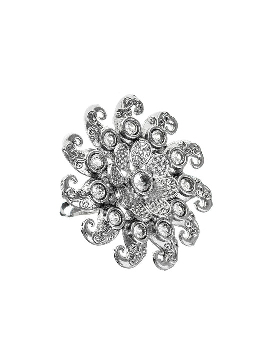 Stepping away from traditional colors, this piece highlights clear, crystal-like stones surrounding a textured geometric center. The silver-tone metal features lined engravings and floral accents, creating a modern-fusion look. This versatile accessory pairs effortlessly with both indo-western outfits and classic traditional wear. Type: Finger Ring Plating: Oxidized Silver Metal: Alloy...