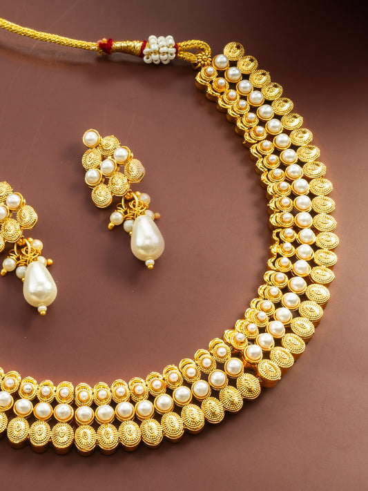 Highlight your ethnic elegance with the Aadita Gold Plated Pearl Beaded Necklace Set. Featuring intricately textured golden beads paired with classic white pearls, this design brings timeless grace to your festive or bridal attire. The coordinating drop earrings add a finishing touch of sophistication, while the adjustable dori ensures a...