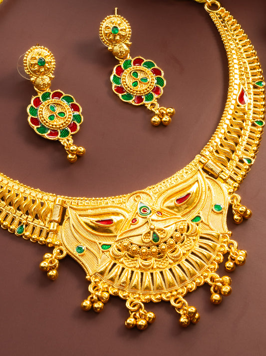 Elevate your traditional look with this exquisite Aadita gold-plated necklace set featuring a temple-inspired pendant and matching earrings. The set is adorned with red and green enamel stones, capturing classic elegance for weddings and festive occasions. Intricate craftsmanship and rich detailing make it a standout piece for ethnic wear. Type:...