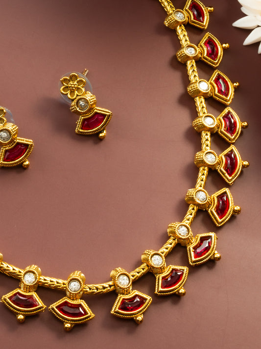Add a bold ethnic flair to your look with the Aadita Gold Plated Red Kundan Necklace Set. Featuring fan-shaped red enamel charms with floral kundan accents, this piece exudes timeless beauty and festive charm. The vibrant red and gold contrast makes it ideal for traditional attire, festive gatherings, or bridal...