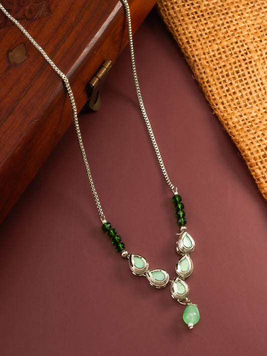 Experience understated elegance with this Aadita contemporary necklace. Designed with a sleek silver-plated finish and delicate green kundan stones, this lightweight piece is ideal for adding a sophisticated touch of color to both modern and semi-formal ensembles. Type: Necklace Plating: Silver Plated Metal: Alloy Stone: Kundan Color: Silver, Green Occasion:...