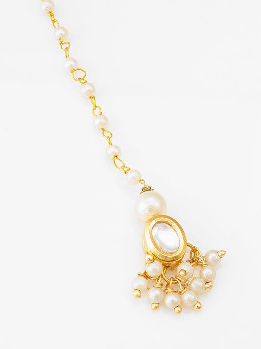 Adorn your forehead with divine elegance using Aadita's gold plated kundan maang tikka. Crafted with brilliant white kundan stones and finished with delicate pearl beads, this traditional tikka brings a graceful accent to ethnic ensembles. Its dual-strand beaded chain enhances the classic charm, making it a perfect choice for weddings,...