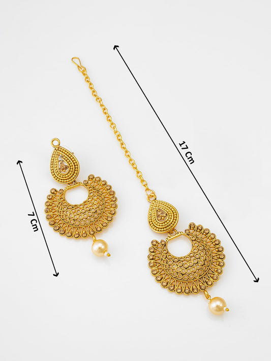 Elevate your ethnic charm with Aadita's gold plated maang tikka set adorned with intricate pearl and stone detailing. The ornate round design paired with drop pearls exudes traditional elegance, perfect for weddings and festive occasions. Crafted for comfort and style, this set enhances your hairstyle while making a statement. An...