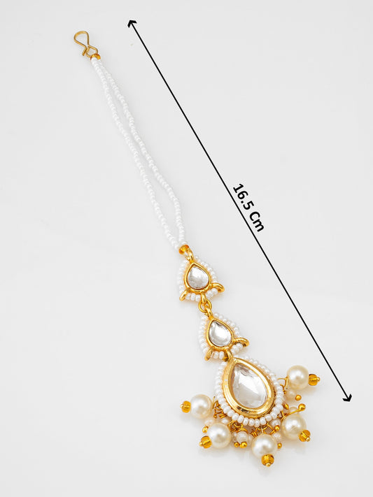 Elevate your ethnic ensemble with this stunning gold-plated maang tikka from Aadita Fashion. Designed in a unique floral and crescent moon pattern, this tikka features embedded kundan stones and elegant white pearls lining the bottom arc. The double-chain pearl beaded string adds a touch of royal grace to your traditional...