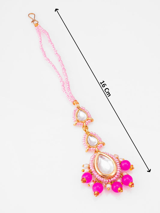 Elevate your festive and bridal look with the Aadita Pink Kundan Pearl Beaded Maang Tikka. This elegant accessory features a teardrop-shaped Kundan centerpiece surrounded by delicate pearls and vibrant pink beads, all strung together with matching beaded chains for a graceful finish. The radiant gold plating enhances its charm, making...