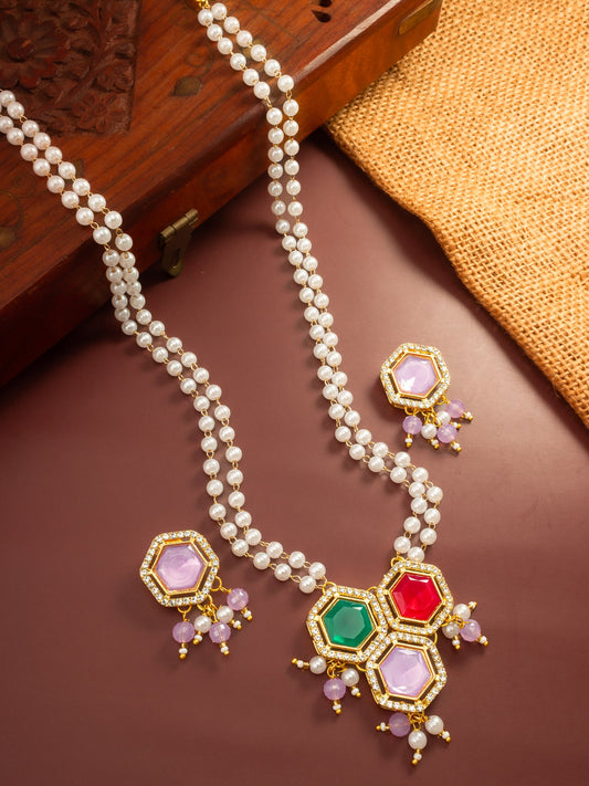This elegant necklace offers a contemporary twist on traditional aesthetics, featuring a triple-hexagon pendant with green, red, and lavender stones. The pendant is suspended from a double-layered white pearl string, offering a refined and premium look. The necklace is finished with a reliable lobster claw hook closure, ensuring the piece...