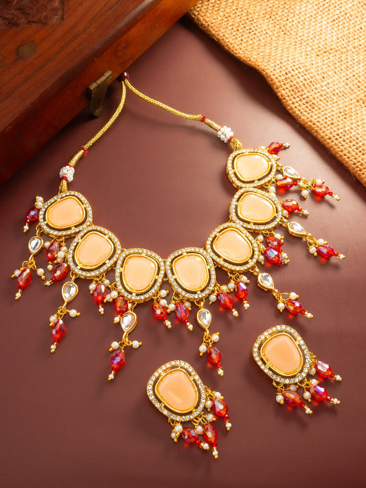 This sales-focused choker set stands out with its unique peach-colored center stones and contrasting red teardrop bead dangles. Each stone is encased in a gold-plated frame accented with brilliant white crystals. The set combines traditional kundan influences with a fresh color palette. It features an adjustable dori closure at the...