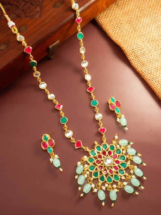 This traditional Aadita necklace set showcases premium kundan craftsmanship, featuring a central floral-inspired pendant adorned with vibrant green and pink stones. The design is further enhanced by delicate mint green bead drops and white stone accents along the chain. This sales-focused ethnic set provides a regal aesthetic suitable for grand...