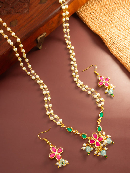 This sophisticated Aadita necklace features two strands of lustrous white pearls accented by pink and green floral stone motifs. The lightweight design provides a premium aesthetic suitable for both semi-formal and traditional gatherings. Unlike traditional thread-back necklaces, this piece is finished with a secure gold-toned lobster claw and link chain...