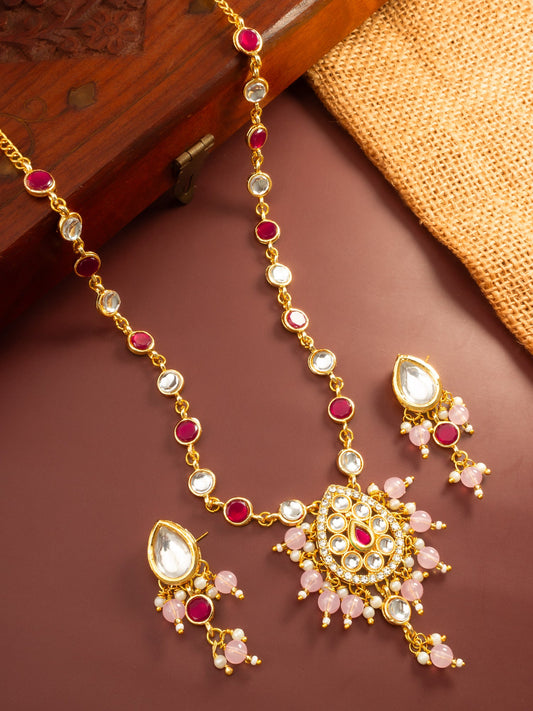 Elevate your ethnic ensemble with this sophisticated Aadita pendant set. The necklace features a gold-plated chain adorned with alternating ruby red and clear kundan stones, leading to a prominent teardrop-shaped pendant. The centerpiece is accented with soft pink beads and clustered pearls for a graceful, feminine touch. The necklace is...