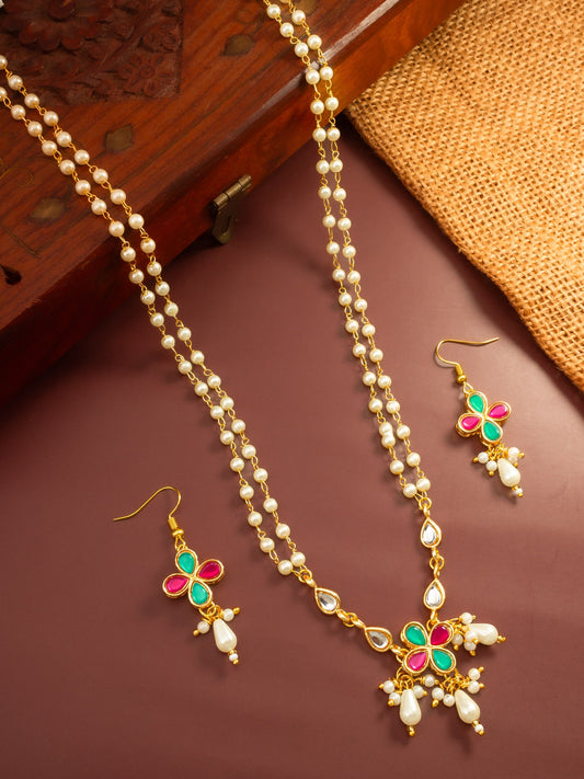 This Aadita necklace offers a refined and minimalist take on traditional jewelry. It features a delicate double strand of high-quality pearls connected to a vibrant floral pendant detailed with emerald green and ruby red stones. Matching drop earrings complete the look, making it an ideal choice for daytime events or...