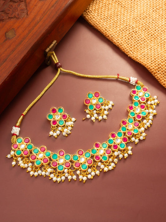 Embodying traditional craftsmanship, this choker set showcases a vibrant alternating pattern of ruby red and emerald green hexagonal stones. The gold-plated alloy base is meticulously detailed with white stone borders and hanging green bead clusters. The necklace features a sturdy adjustable dori closure for comfort and versatility, making it a...