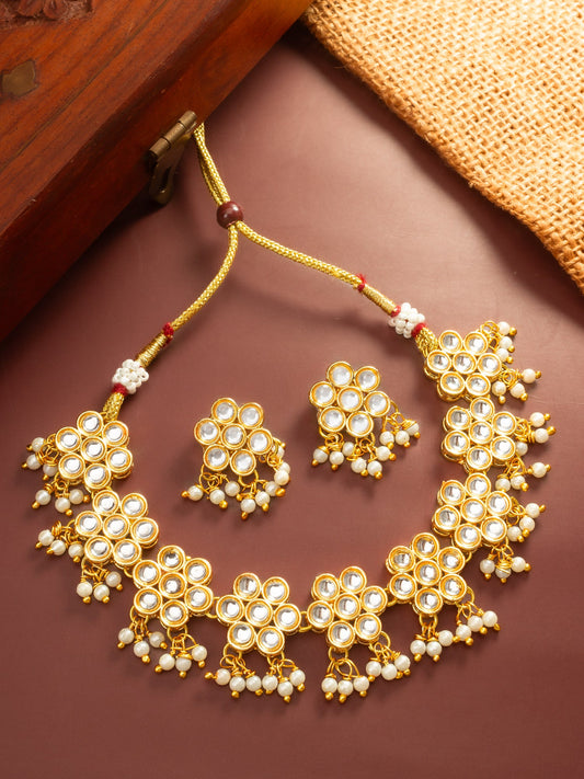 This premium choker set by Aadita showcases the timeless elegance of traditional kundan craftsmanship. The necklace features a series of circular floral motifs encrusted with shimmering white stones and finished with delicate pearl droplets for a royal aesthetic. Designed for comfort and versatility, the necklace is secured with an adjustable...