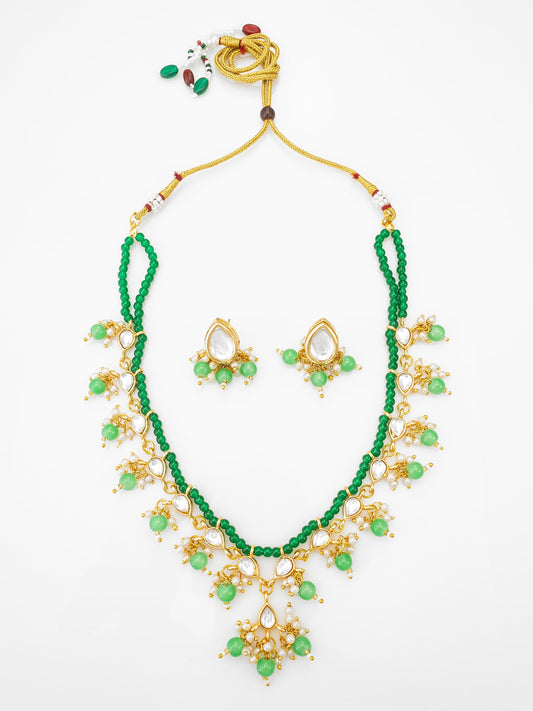 Adorn yourself with timeless charm in this Aadita gold-plated kundan necklace set, featuring sparkling white kundan stones and dangling green beads. The layered green beaded strands lend a regal look, beautifully complemented by the coordinating earrings. Ideal for wedding or festive looks, this exquisite set adds a graceful pop of...
