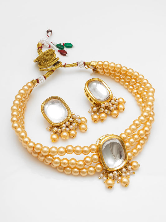 Grace your ethnic look with this elegant gold-toned Kundan choker necklace set from Aadita. Designed with classic pearl bead strings and oversized kundan centerpieces, this traditional yet trendy set is perfect to elevate bridal and festive outfits. The three-layered beaded necklace sits gracefully around the neck while the matching stud...