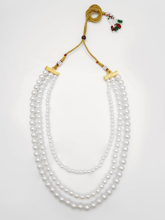 Add timeless elegance to your ethnic ensemble with this Aadita white multi-strand pearl beaded long necklace. Featuring three graceful layers of glossy faux pearls in graduated sizes, this necklace brings a sophisticated charm to your festive and traditional looks. Perfect for weddings, pujas, and cultural celebrations, it beautifully complements sarees,...