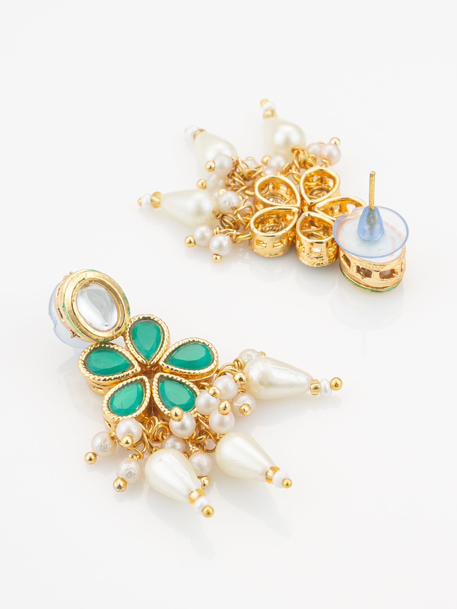 Elevate your ethnic style with Aadita's exquisite white and green kundan pearl necklace set. Intricately handcrafted with floral motifs, this set exudes timeless elegance. The layered pearl strands blend beautifully with the kundan-studded pendant, offering a rich and regal look. Ideal for weddings and traditional occasions, this lightweight set adds graceful charm to any ensemble.